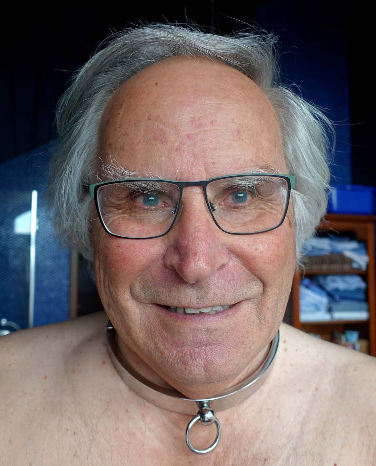 hängt sich den Halsreifschlüssel an einer goldenen Kette um den